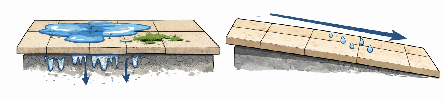 C'est précisément ce qui rend les erreurs particulièrement coûteuses : elles ne se voient pas toujours immédiatement. La terrasse peut sembler parfaite au moment de la pose, puis se dégrader progressivement au fil des saisons. Ce sont souvent des défauts invisibles au départ (un support mal préparé, une pente insuffisante, un joint inadapté) qui finissent par provoquer des fissures, des décollements ou des infiltrations. Et lorsqu'il faut intervenir, les reprises impliquent souvent une dépose complète, un remplacement partiel du matériau et un chantier lourd.