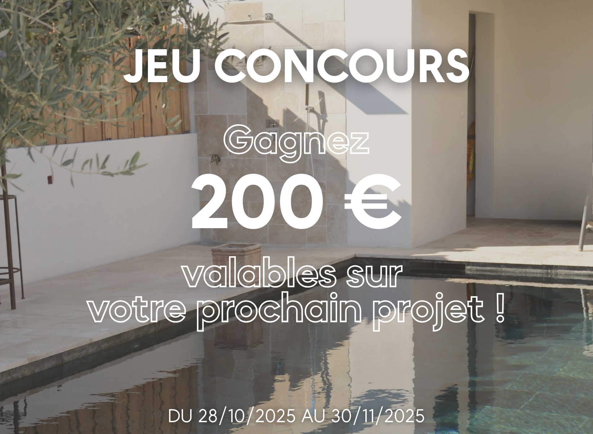 Pour participer en toute transparence, consultez le règlement officiel du jeu 👉 Télécharger le règlement « 200 € sur votre projet ! » (PDF). Règlement également disponible sur simple demande dans nos showrooms de Lunel et Juvignac.