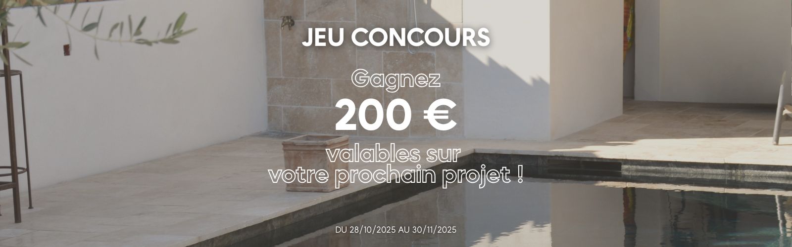 Un(e) heureux(se) gagnant(e) remportera une remise de 200 € TTC à valoir sur un projet Perles de Pierres : terrasse, allée, margelles, parement, bassin ou tout autre aménagement intérieur ou extérieur. Cette remise sera valable sur un devis validé entre décembre 2025 et mars 2026, en une seule fois sur la facture finale.